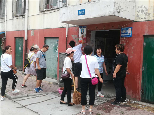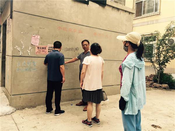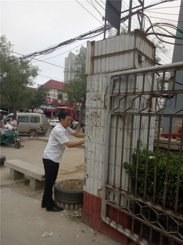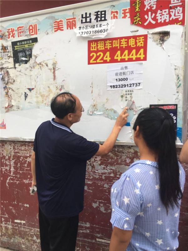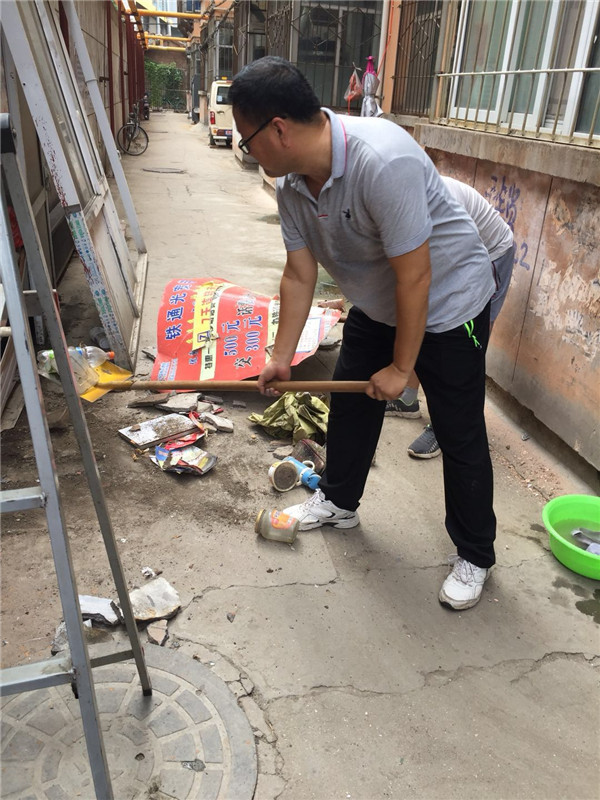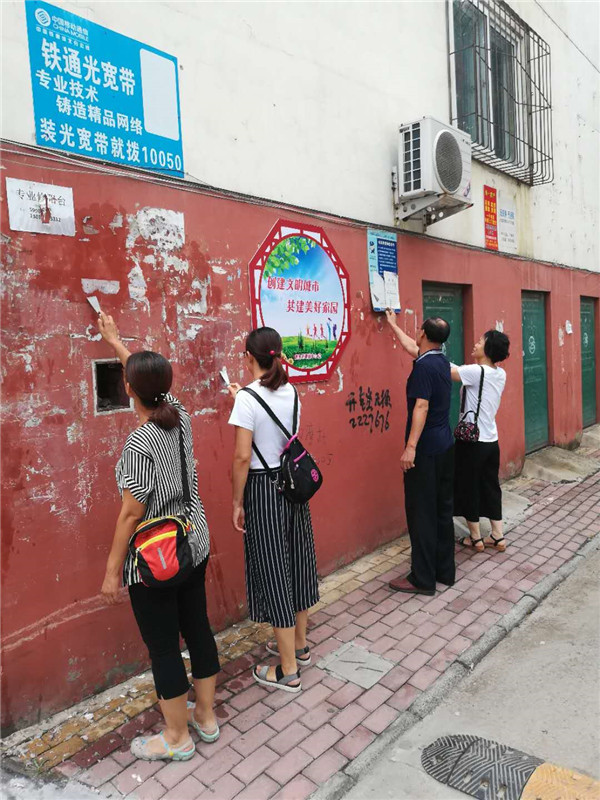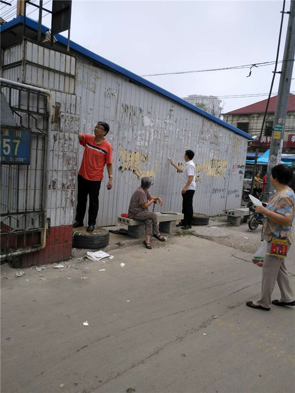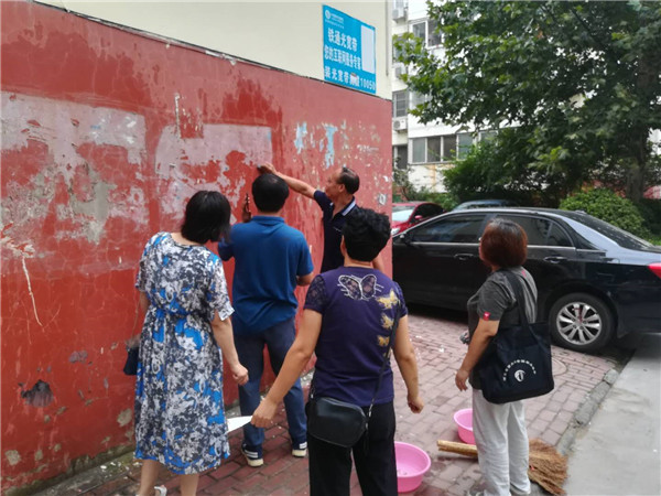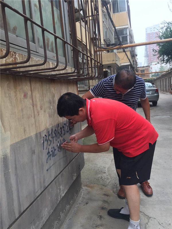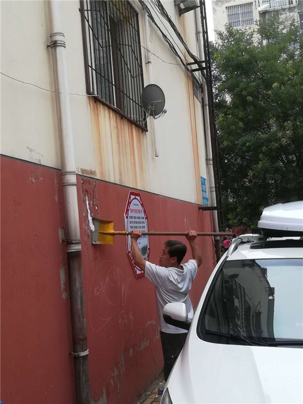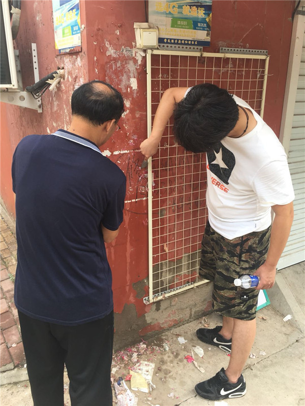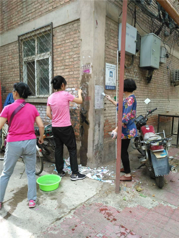 老师们带着铁锨、铲子、水盆等工具,采取分楼包片的形式,对小区内的小广告进行了地毯式清理。小广告的清理工作需要时间与耐心,因为小广告张贴的很多,胶性很强,很难清理,需要多次用水润湿用铲子用力铲才能清理干净。有的小广告贴的位置很高,老师们向居民借来凳子,站在凳子上进行清理。经过一上午的紧张劳动,楼体外墙、楼道面貌焕然一新。在清理小广告的同时,老师们还向居民们宣传创城相关知识,营造了良好的创城氛围。