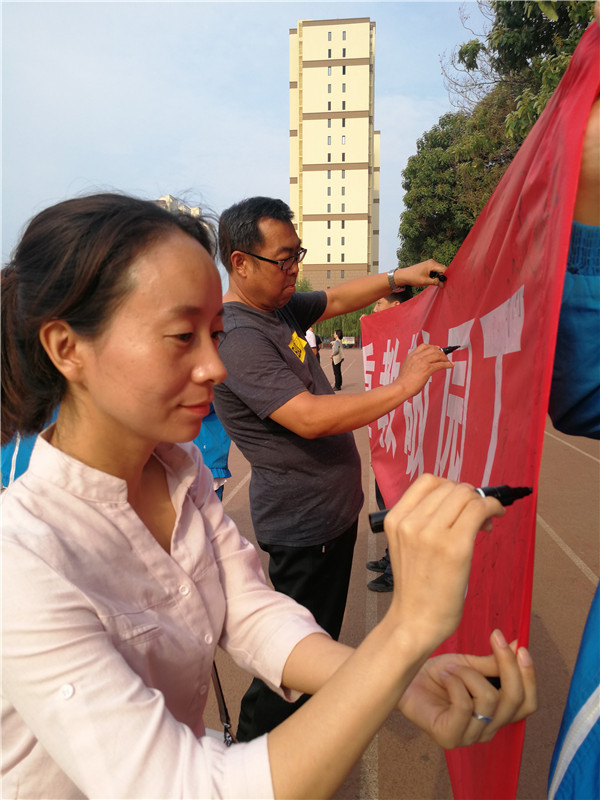 一句句节日的温馨祝福,一个大大的拥抱,幸福的微笑洋溢在老师们的脸庞。10日上午,在舒缓的音乐声中,学校艺术部学生为教师献上歌伴舞《每当走过老师窗前》,升学部同学献上诗朗诵《教师赞歌》。学生们通过悠扬的歌声和动感的舞姿,声情并茂的诵读,尽情表达了对学校的热爱,以及对老师的感激之情,使教师节变得温馨而感人。随后,学校6300名师生共同在条幅上签署了心中的美好祝福,用独特的方式表达对全校教师的节日问候和感恩之情,以此迎接第34个教师节的到来。
