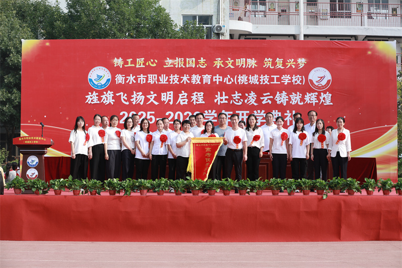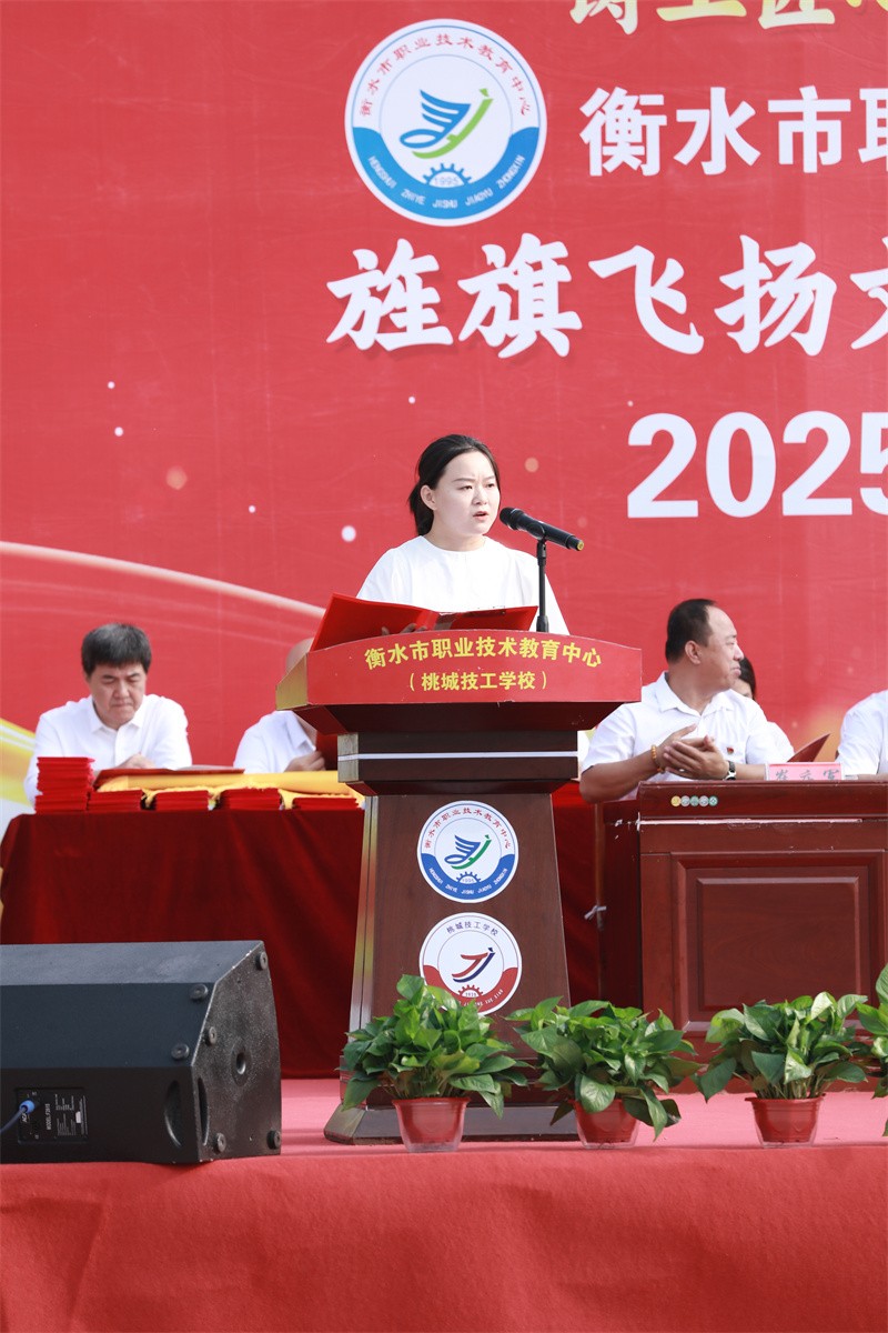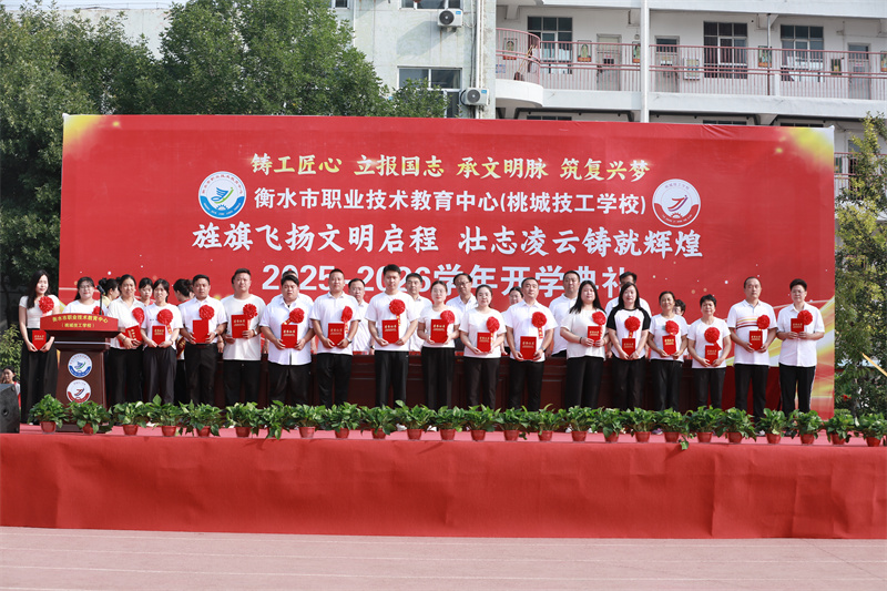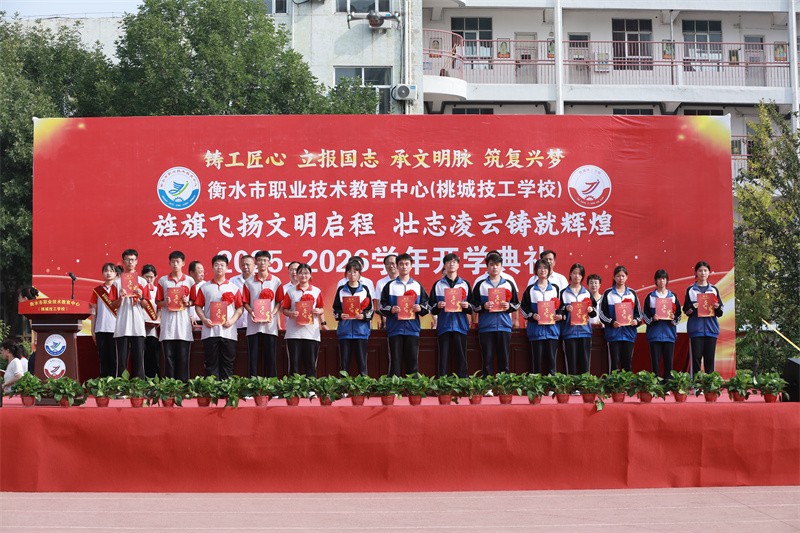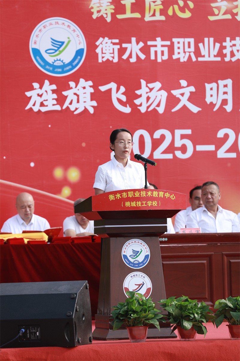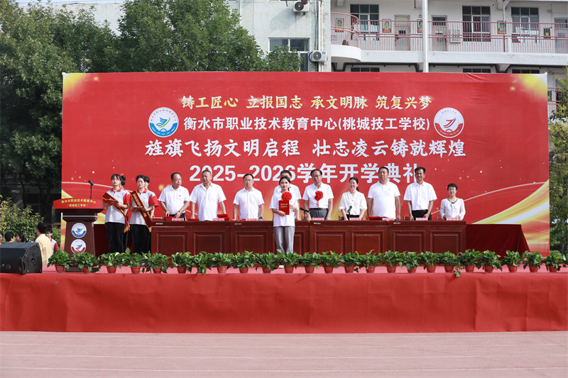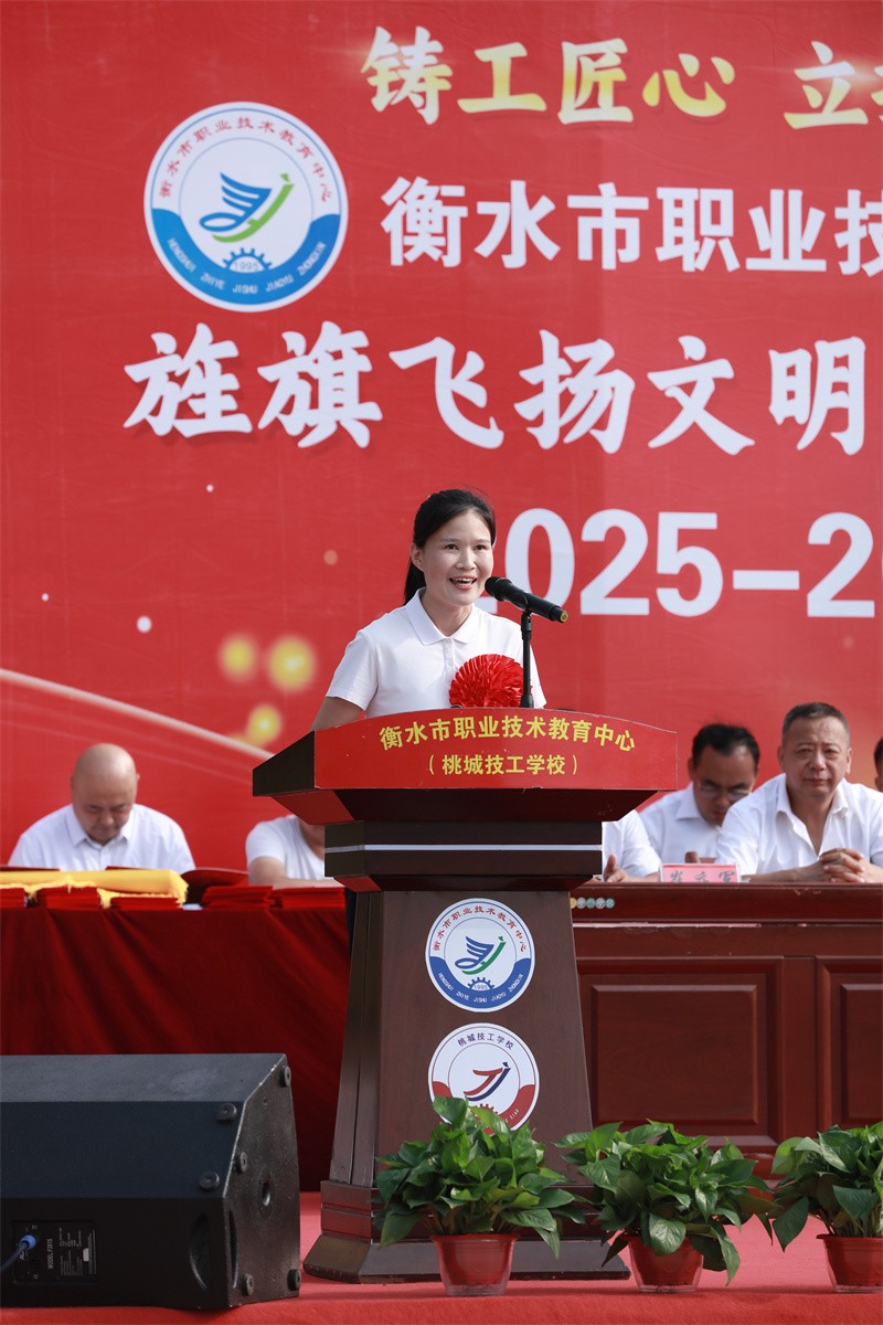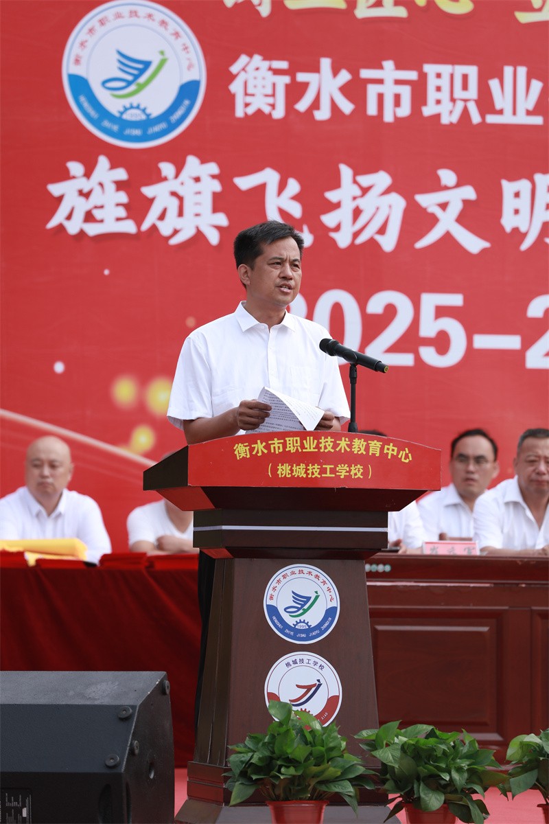 9月15日上午,衡水市职业技术教育中心(桃城技工学校)2025-2026学年度秋季开学典礼在体育场举行。学校党总支书记岳国武,党总支副书记郝艳宁,纪检书记马振勇,副校长石保真、孙斌、李建雨出席大会。校委会委员、各系(处)室主任、全体教职工、全体学生参加大会。大会由党总支副书记郝艳宁同志主持。