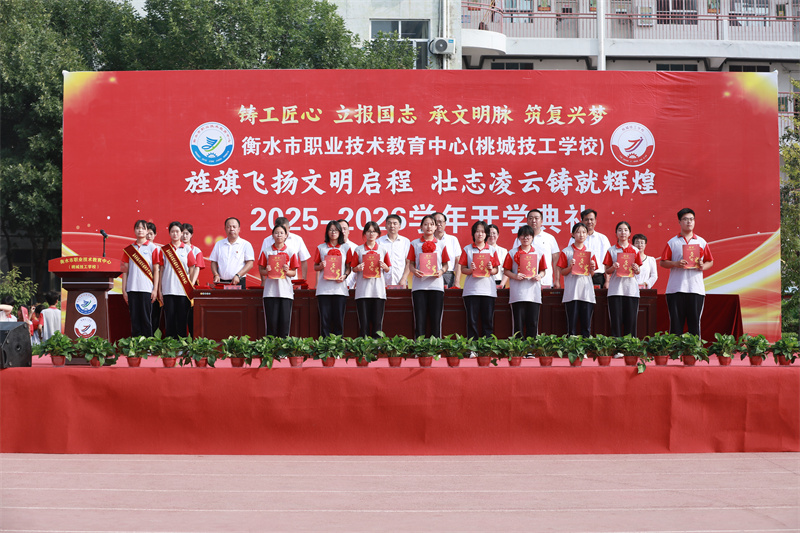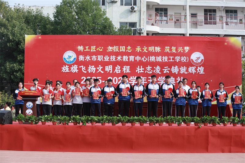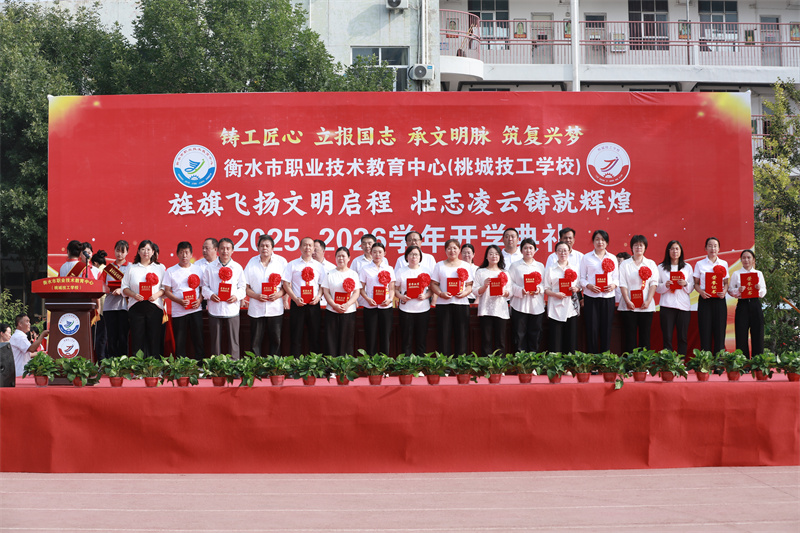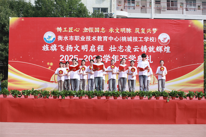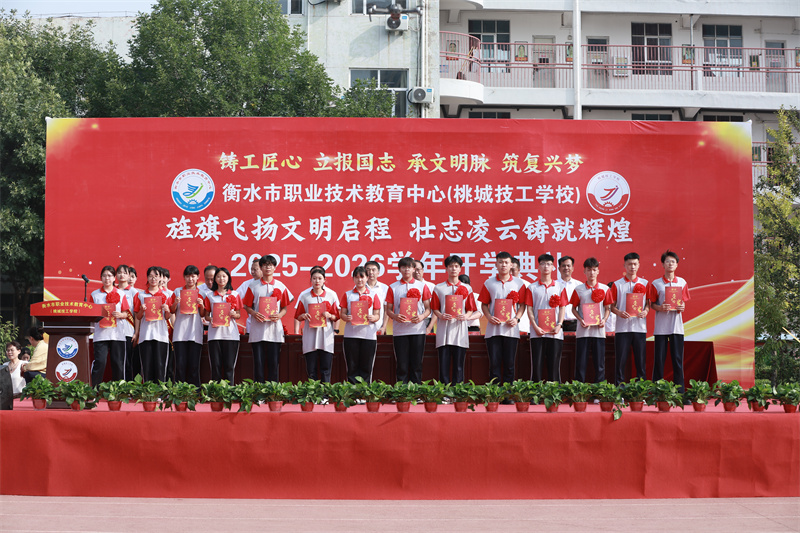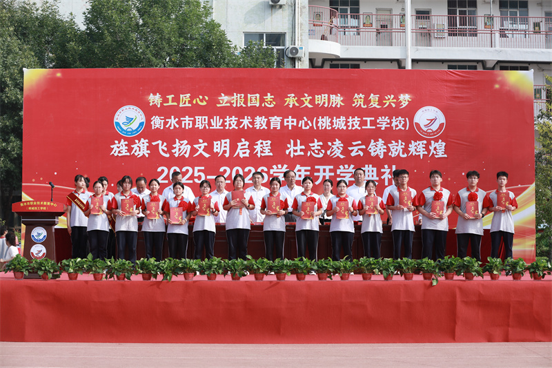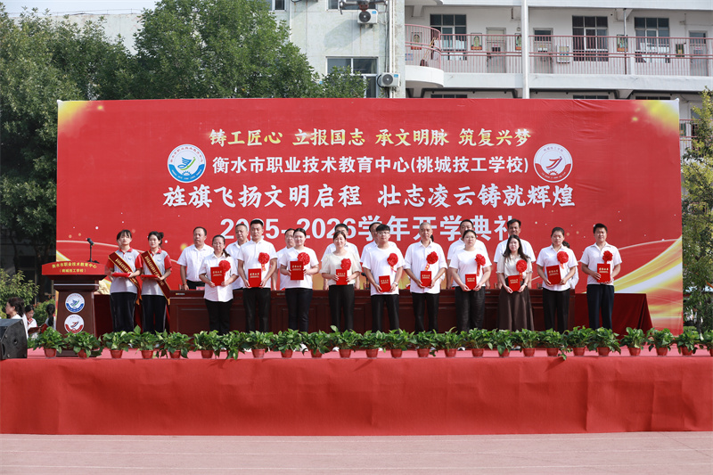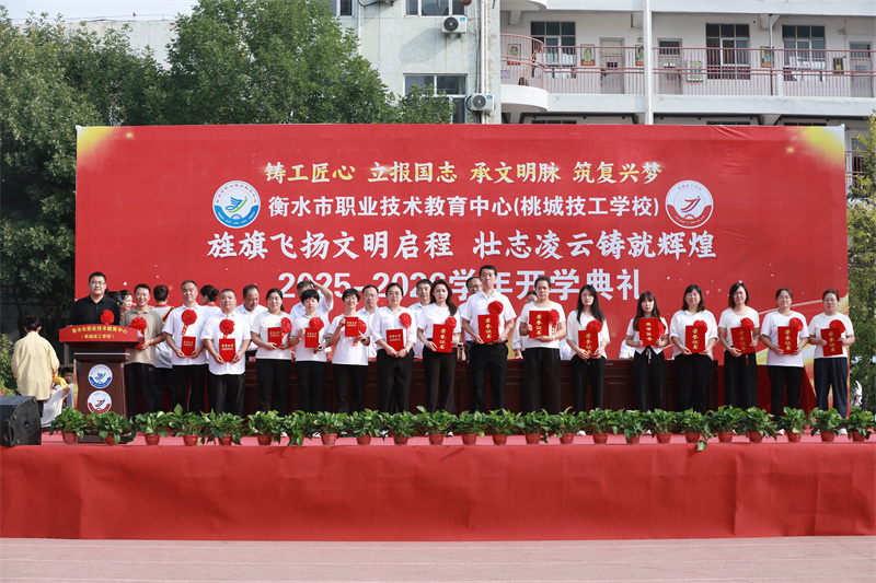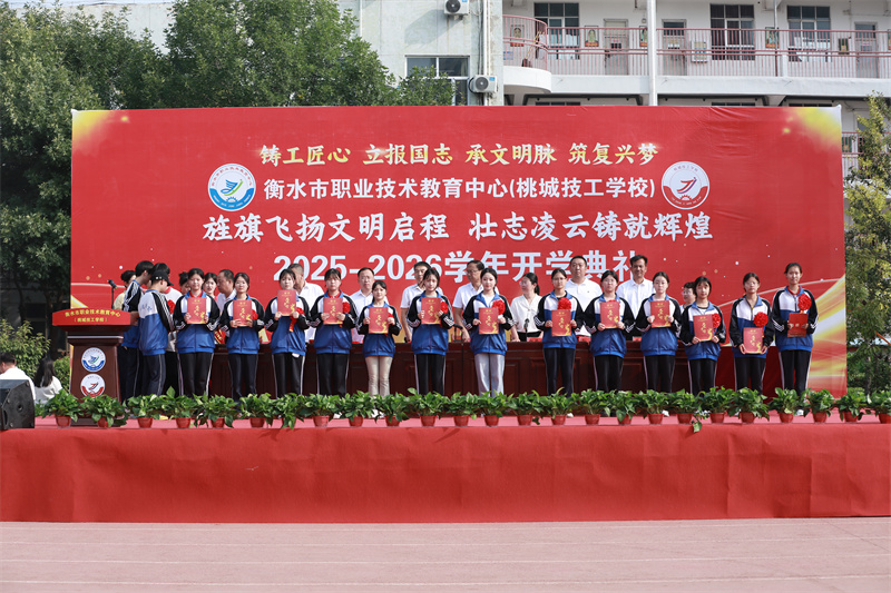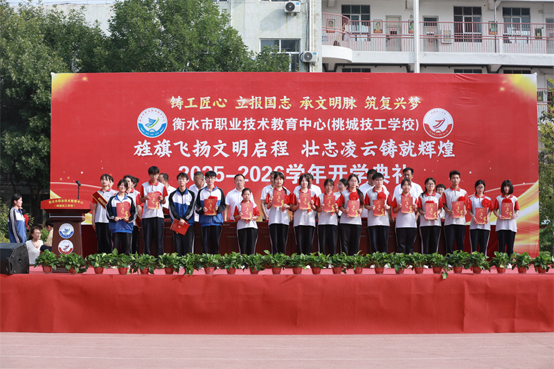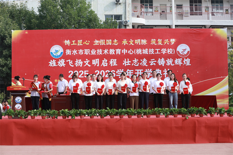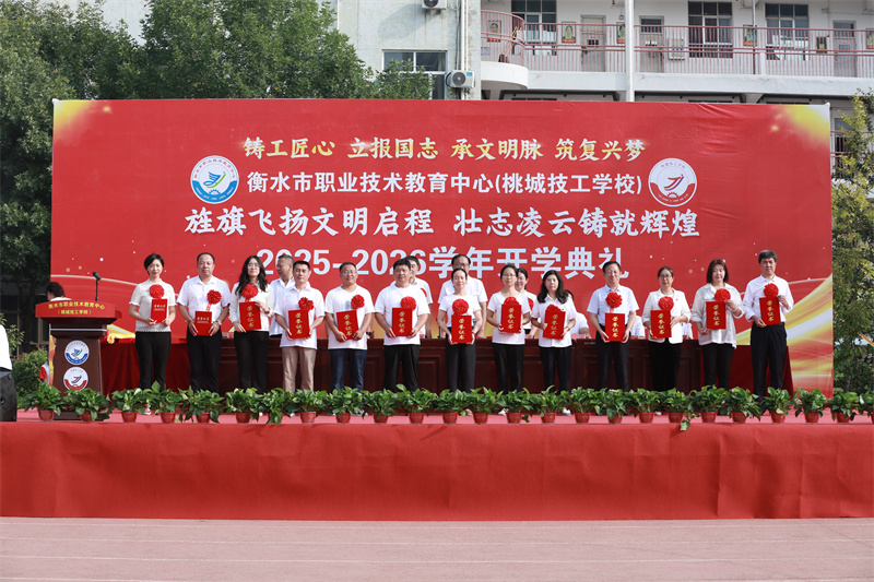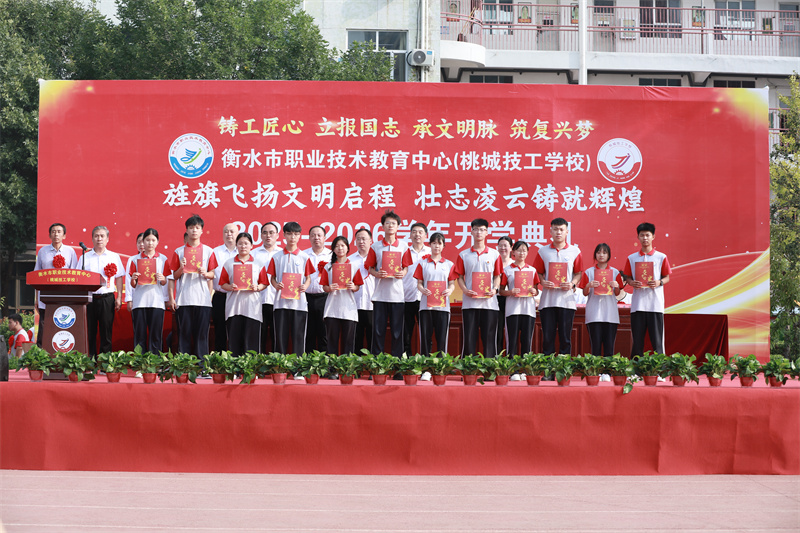 9月15日上午,衡水市职业技术教育中心(桃城技工学校)2025-2026学年度秋季开学典礼在体育场举行。学校党总支书记岳国武,党总支副书记郝艳宁,纪检书记马振勇,副校长石保真、孙斌、李建雨出席大会。校委会委员、各系(处)室主任、全体教职工、全体学生参加大会。大会由党总支副书记郝艳宁同志主持。